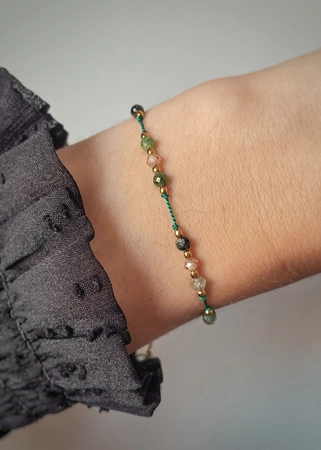 Bracelet natural stones zoisite with ruby zircon, champagne, silk thread