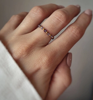 Pierścionek elastyczny kamienie naturalne cyrkonia beżowa i granat