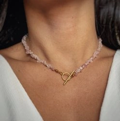 Necklace made of natural stones. Rose quartz, gold-plated toggle
